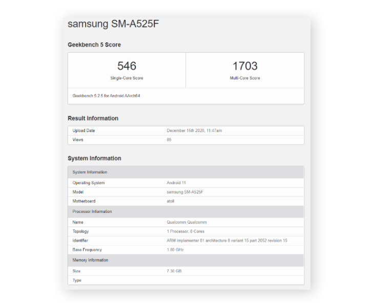 The benchmarks for the Galaxy A52 4G could be discovered beneath the mannequin quantity “Samsung SM-A525F”. Its scorecard reveals 529 factors on single-core and 1704 factors on multi-core checks. To place these Samsung mobiles numbers in perspective, final yr’s Galaxy A51 peaks at 349 and 1222 on single and multi-threaded duties.